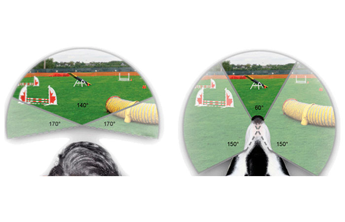 Глаз человека имеет поле зрения в форме круга, у собаки же оно «растянуто» в стороны. Поле зрения собаки составляет 240-250 градусов, это лучше, чем у людей (180 градусов) и кошек (200 градусов). Однако показатели сильно варьируются в зависимости от породы.