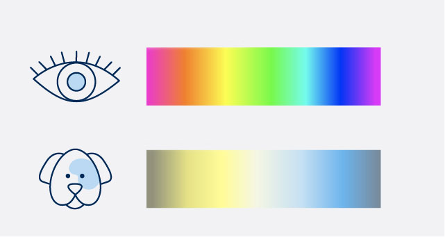 У людей есть 3 типа колбочек, а у собак — 2. Это означает, что люди обычно могут идентифицировать 3 цветовых комбинации (красный, синий и зеленый), а собаки ограничены двумя (желтый и синий).