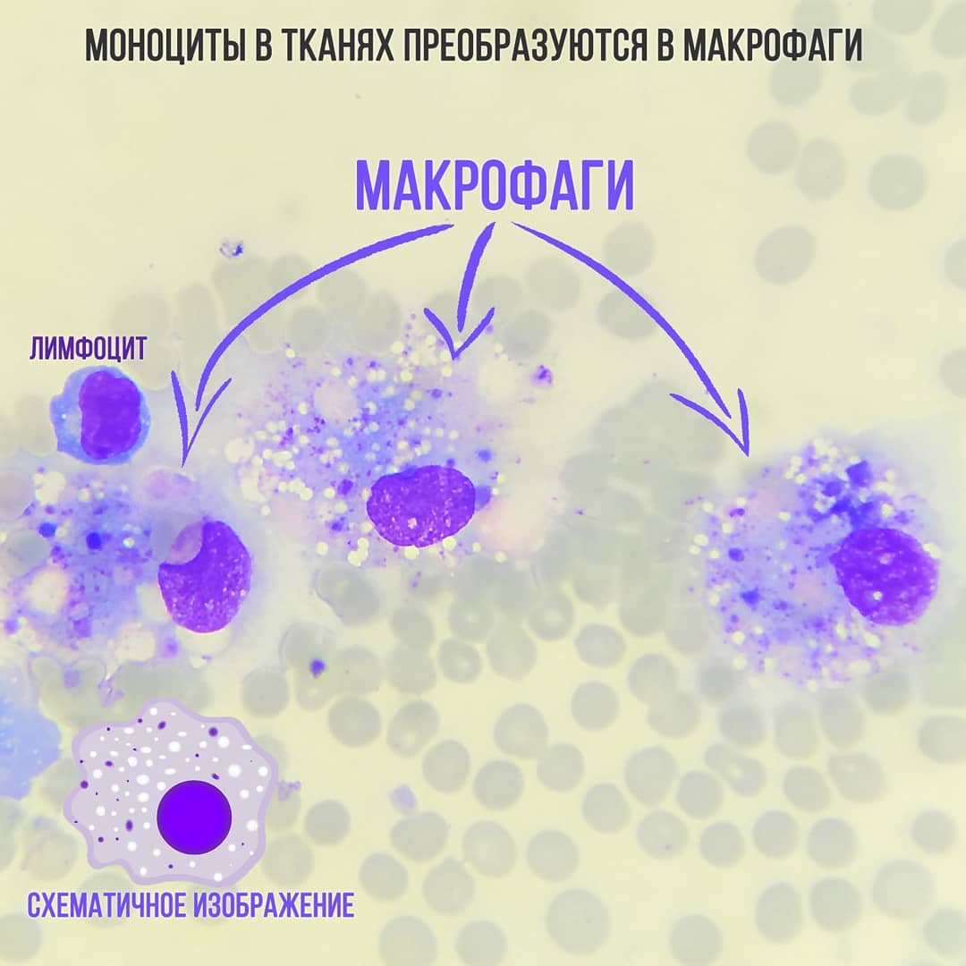 Самые большие лейкоциты. Они пожирают микроорганизмы, омертвевшие клетки и ткани, уничтожают раковые клетки и в процессе вышеперечисленного передают информацию о антигене лимфоцитам.