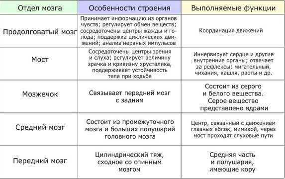 Головной мозг состоит из следующих отделов: передний мозг представлен большими полушариями, промежуточный мозг, задний мозг представлен промежуточным мостом и мозжечком и продолговатый мозг.