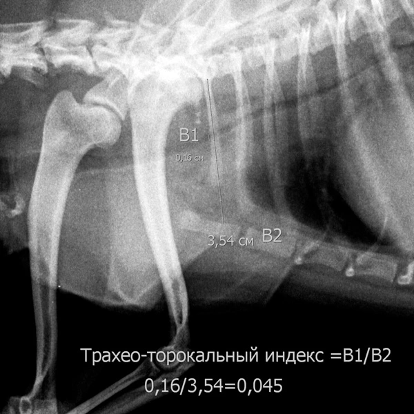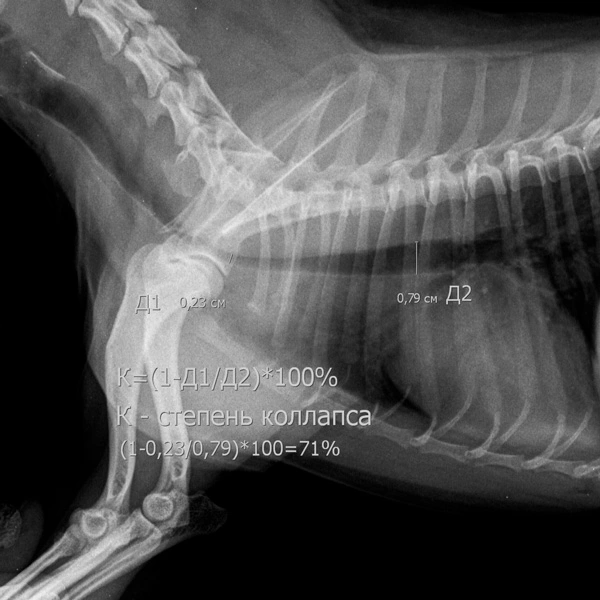 Основой диагностики коллапса трахеи у собаки является рентгенологическое исследование, при помощи которого можно оценить изгибы органа, а так же выяснить его просвет. Следует отдельно отметить, что при невыраженной степени коллапса (или пролапса) и спадении стенок, только при определенных фазах дыхания — на вдохе или на выдохе, при рентгенологическом исследовании можно получить ложноположительные или ложноотрицательные результаты. Следует быть особо внимательными с животными, у которых наблюдаются нарушения дыхания и широко понимать причину их возникновения. Нередко, наряду с диагностикой заболеваний органов дыхания у собак приходится диагностировать заболевания органов сердечно-сосудистой системы, так как они связаны между собой неразрывно.
