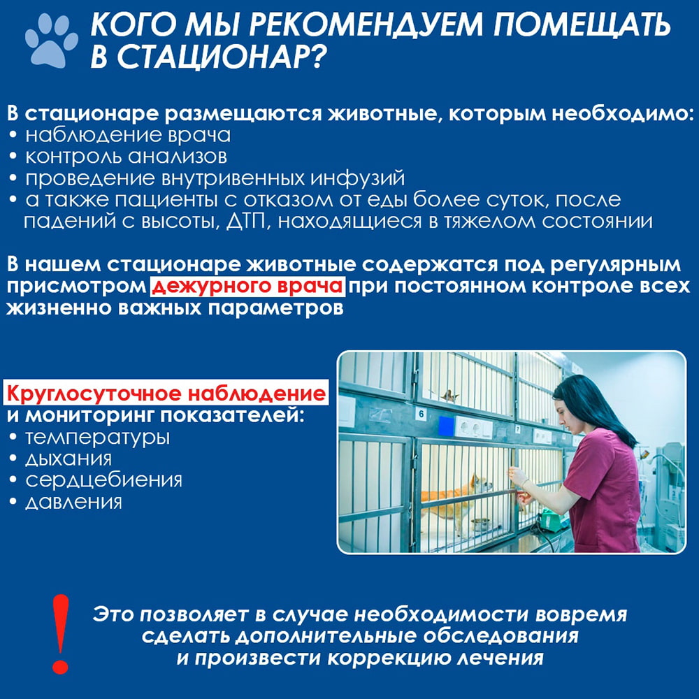 Если Вашему четвероногому другу назначили полное диагностическое обследование для постановки верного диагноза — Вы всегда можете его оставить в отделении нашего стационара. Ветеринарные специалисты работают круглосуточно и готовы оказать своевременную помощь каждому животному.