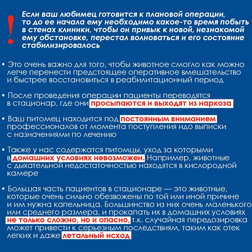 Если Вашему питомцу требуется серьезная и более тщательная подготовка к операции, а затем и дальнейшая реабилитация — помните, в нашем круглосуточном стационаре организованы самые лучшие условия для пред и послеоперационного пребывания животного и его быстрого выздоровления.