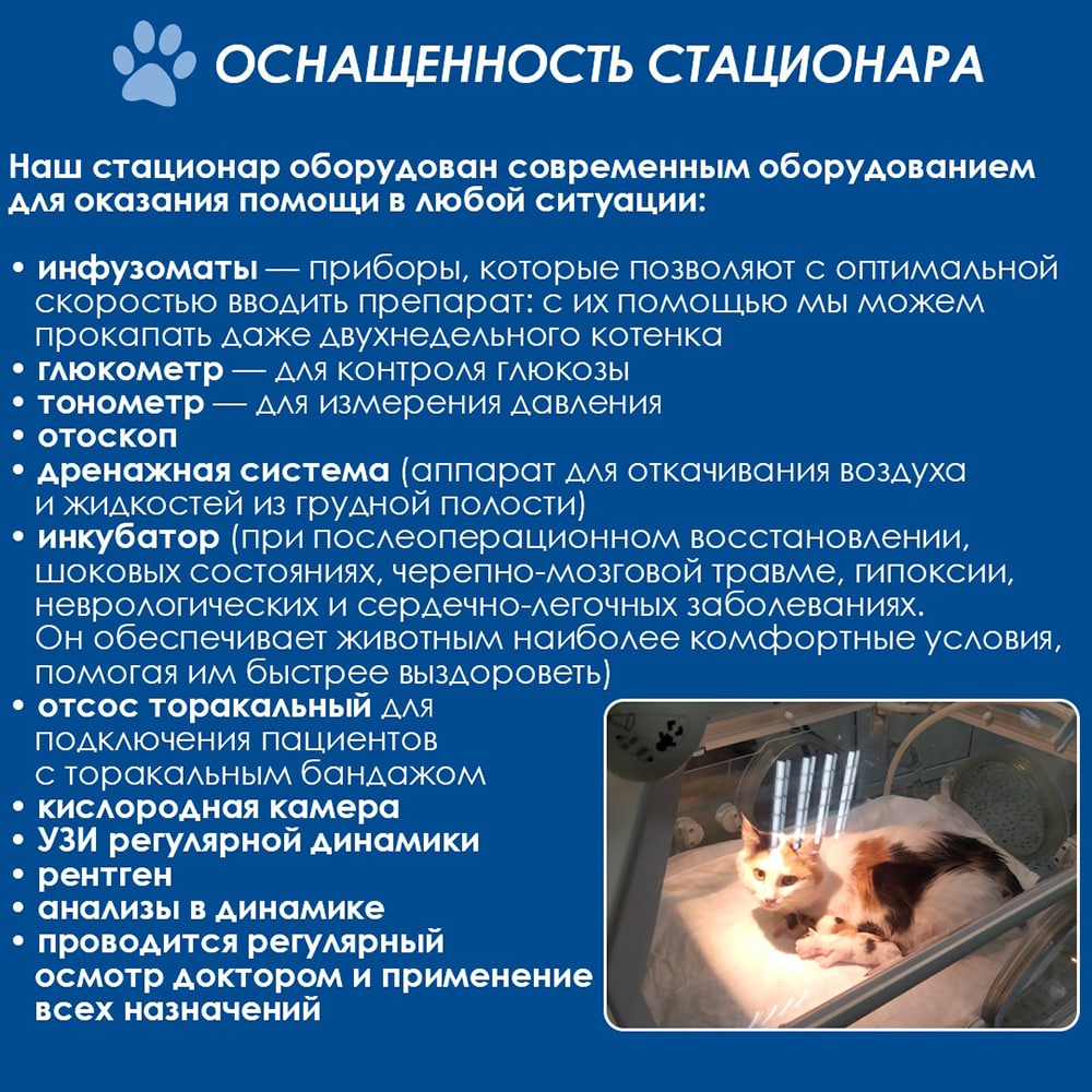 И помните, для этого в отделении стационара есть все необходимое. Современное высококлассное оборудование, стерильный инструментарий и расходные материалы, новейшие техники лечения и реабилитации домашних питомцев, опытные и самые заботливые ветеринарные врачи, а также весь внимательный персонал ветеринарного центра.