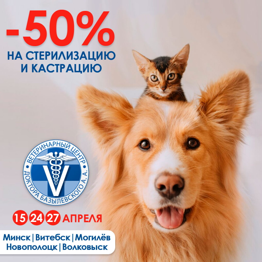 15, 24 и 27 апреля 2022 года во всей сети Ветеринарных центров доктора Базылевского А.А. скидка 50% на стерилизацию и кастрацию